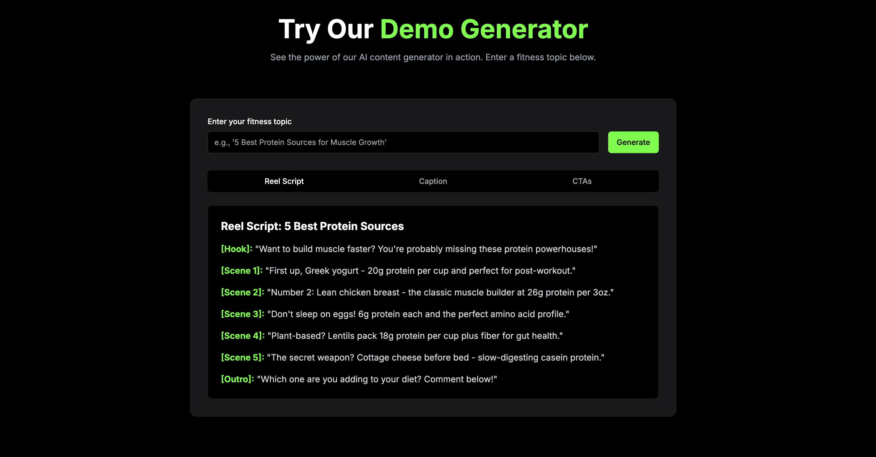 Generates fitness content, captions, and CTAs from just a topic title.